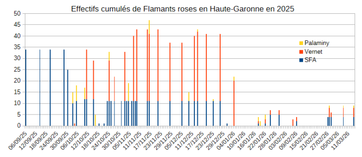 Evolution du nombre de Flamants roses observés en Haute-Garonne : automne-hiver 2025-2026