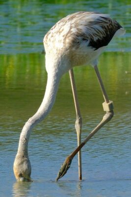 Un Flamant rose immature muni d’une balise à Sainte-Foy d’Aigrefeuille, présumé d’origine sarde