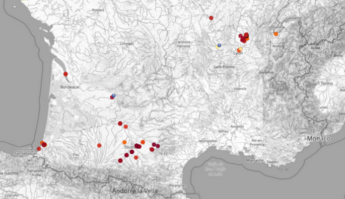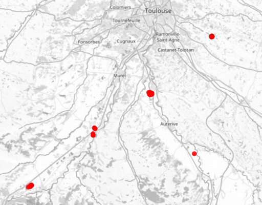 Les observations de Flamants roses en Haute-Garonne en automne-hiver 2025-2026. Entre Palaminy au sud-ouest et Le Vernet au centre de la carte, il y a 40km soit environ 1/2h à vol de Flamant. Capens est à mi-chemin entre ces 2 sites (source Faune-France6)