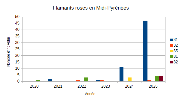 L'observation de flamants roses en Haute-Garonne débute en 2021 avec un 1er individu en janvier puis 2 individus en décembre observés au Lac des Quarts (Capens), tous immatures (1A et/ou 2A).