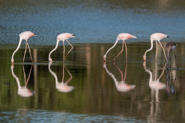 Les 4 Flamants roses adultes et un juvénile (© Yves Lécureux)
