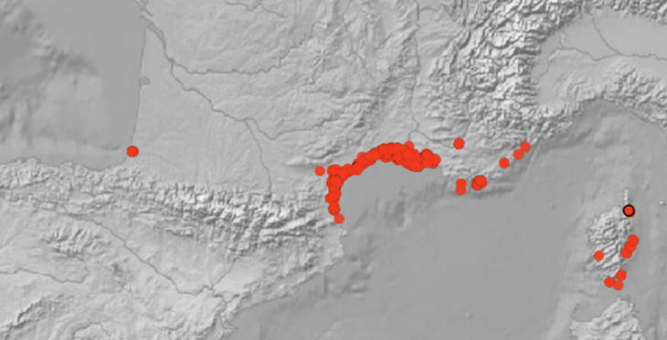 - Aude, intérieur des terres : un individu mort observé le 28 septembre du coté du lac de la Ganguise.