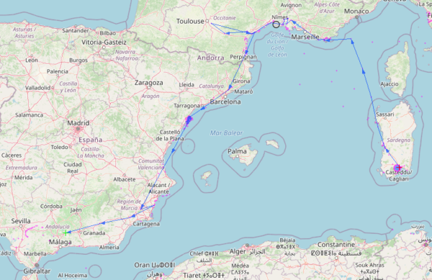 Hormis le flamant bagué en Sardaigne qui a fait un aller-retour depuis la côte méditerranéenne, on n’a pas d’informations et donc on ne peut que spéculer sur les itinéraires sans aucune certitude. Ce que l’on sait c’est qu’ils sont capables de grands trajets au-dessus de la mer ou de la terre. La carte ci-après illustre les itinéraires de 42 Flamants roses équipés GPS en Sardaigne en 2025.